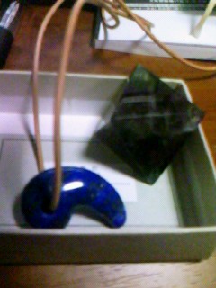 前はタイガーアイとアメジストの勾玉を買ったんですが、今回は画像の蛍石の正八面体と、ラピスラズリの勾玉を購入しました。